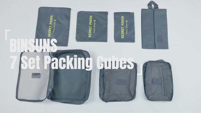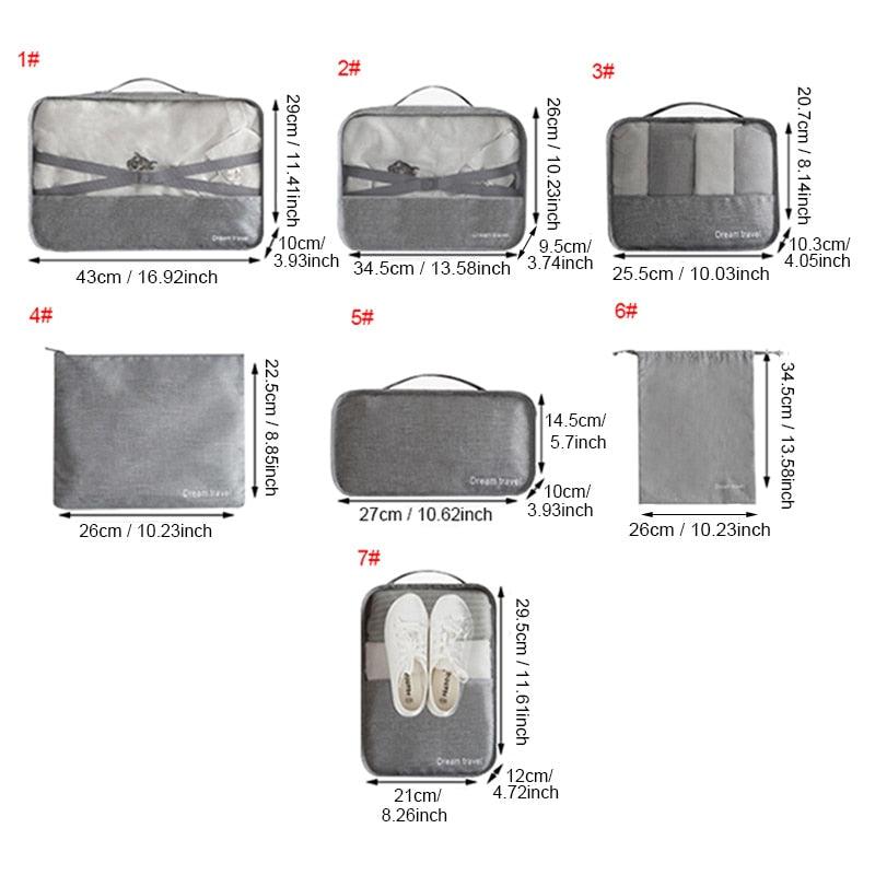 Our 7-piece fabric packing organizers cubes set is the perfect solution for organized travel. This complete pack includes 3 packing cubes, 1 shoe bag, 1 large laundry bag, 1 toiletries bag, and 1 accessories bag. With various sizes to choose from, these essential travel bags can store classified clothes, dirty laundry, bras, underwear, footwear, cosmetics, towels, toiletries, and electronic accessories, making your journey hassle-free and enjoyable.